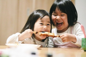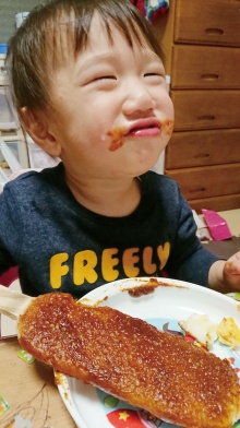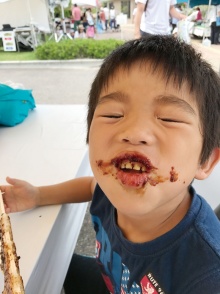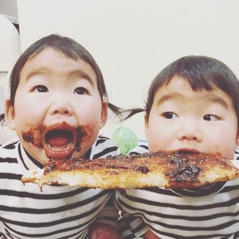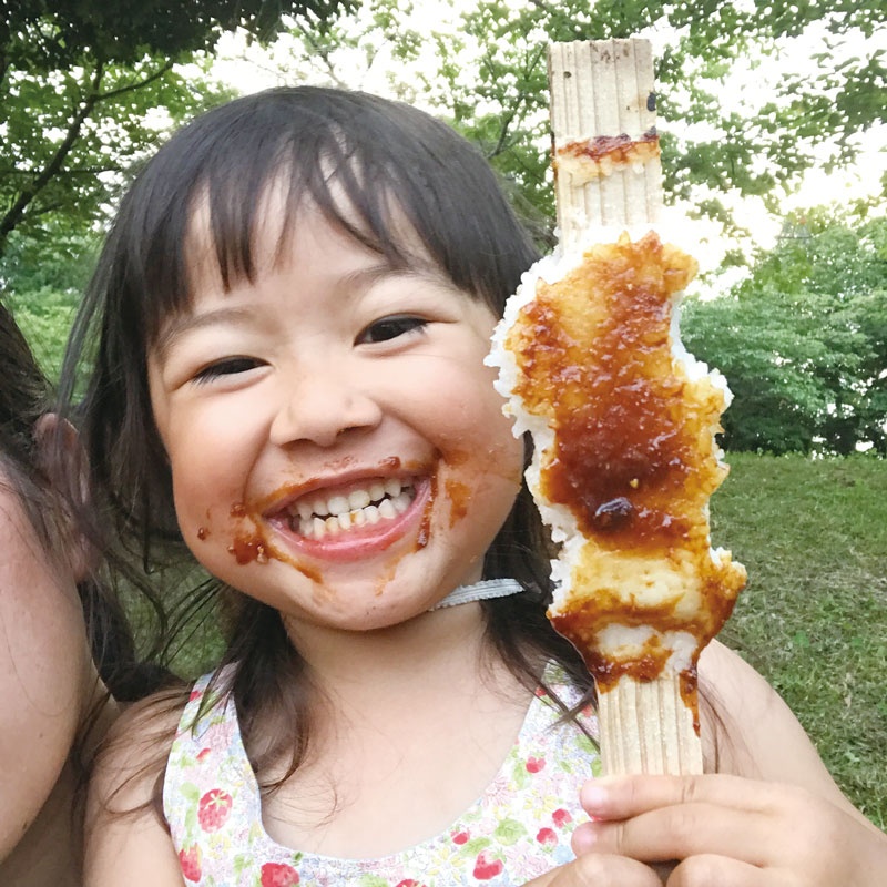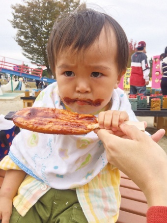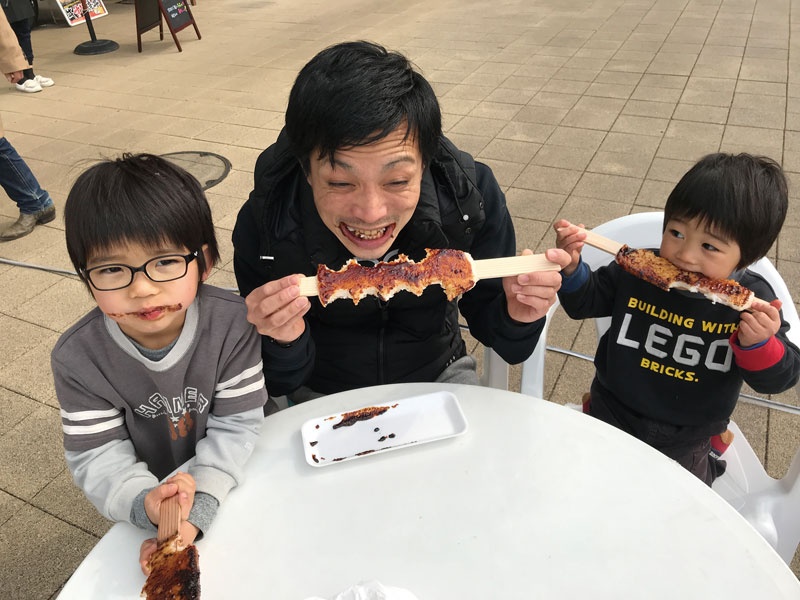 五平餅が大好き家族ですが、なかでも「しもやまの里」の五平餅がとびきり好きなので、ドライブがてら買いに行く事が多いです。この日は、我が家の2歳になったばかりの末っ子双子が無心でかぶりついていたので思わずパシャリ!