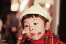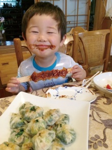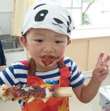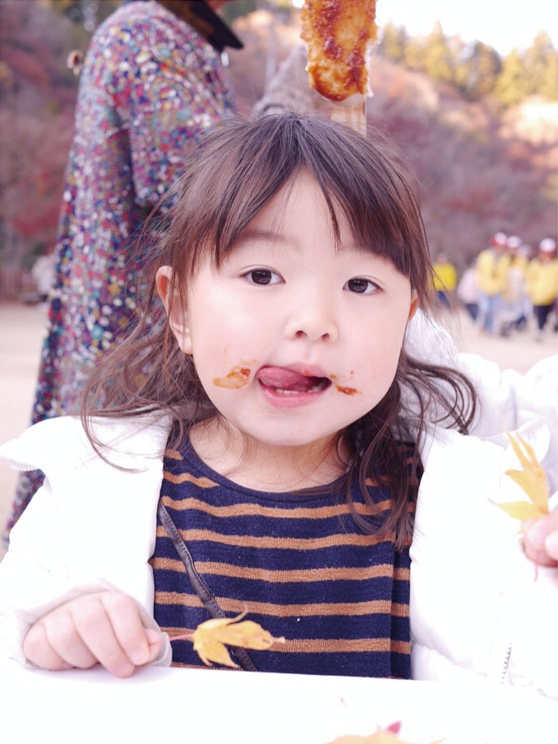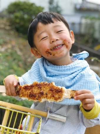 五平餅を食べて目をつぶりながらにっこりしている(幸せな感じ)ところが微笑ましい!