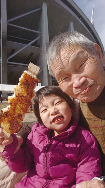 世代を超えた五平餅愛!そっくりな笑顔に心が和む一枚です。これからも仲良く五平餅食べてね!